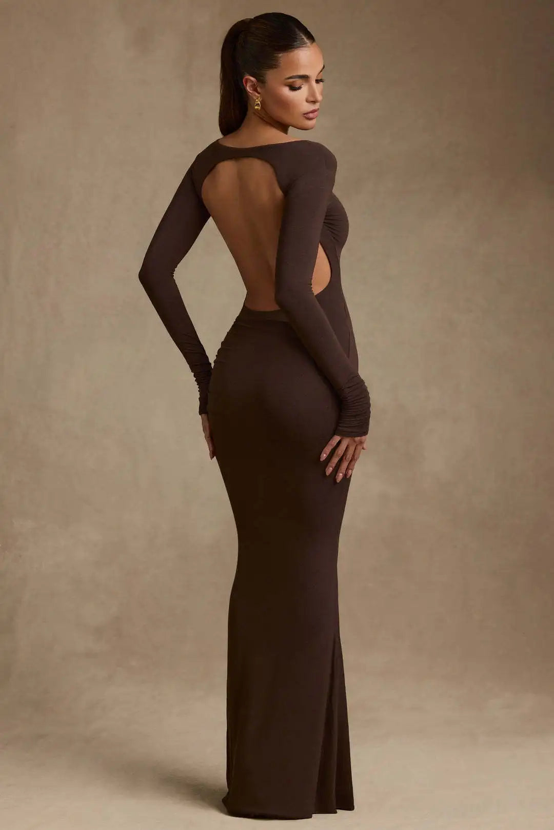 גב פתוח בעיצוב מרשים מוסיף טאץ’ נועז ואלגנטי, עם שרוולים ארוכים שמאזנים את המראה.
