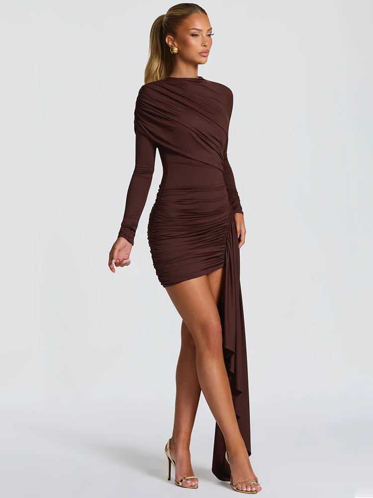 שמלת מיני צמודה עם כיווצים מחמיאים שמעצבים את הגוף ומדגישים את המותן והירכיים בצורה נשית ועוצמתית.
