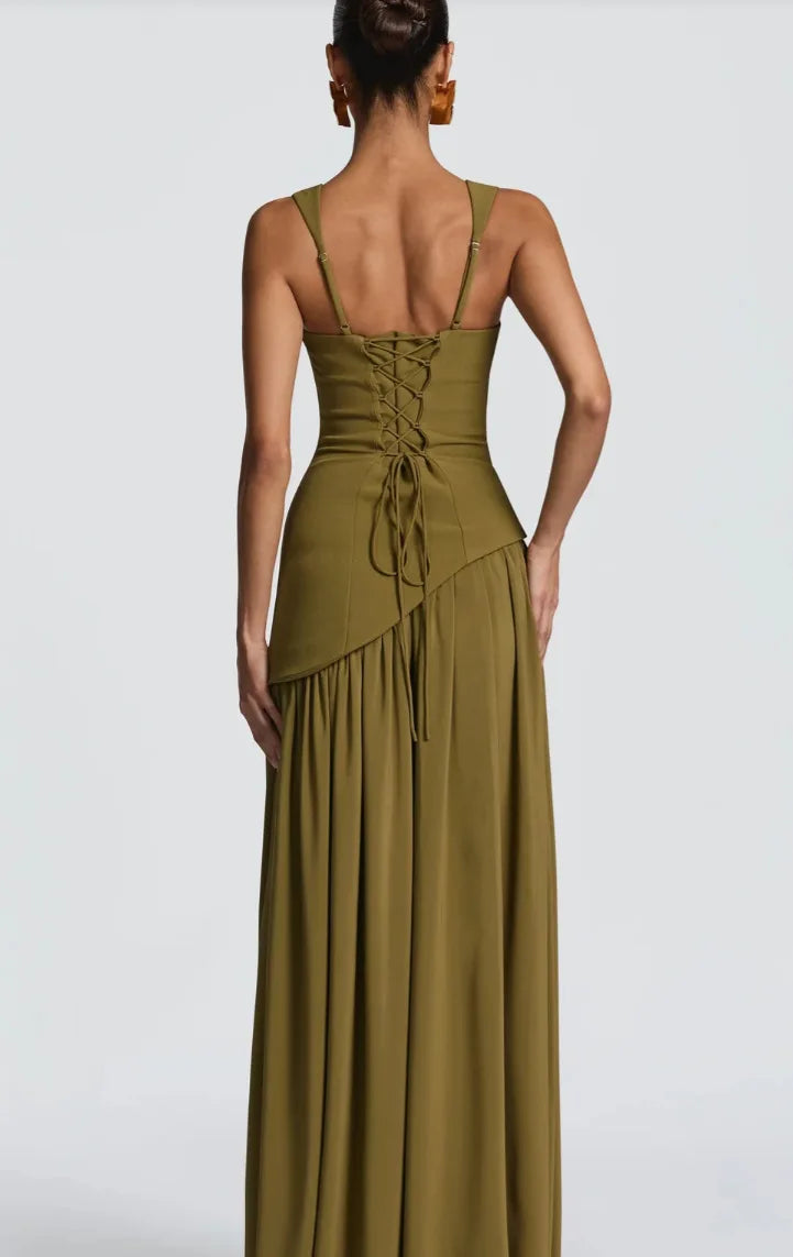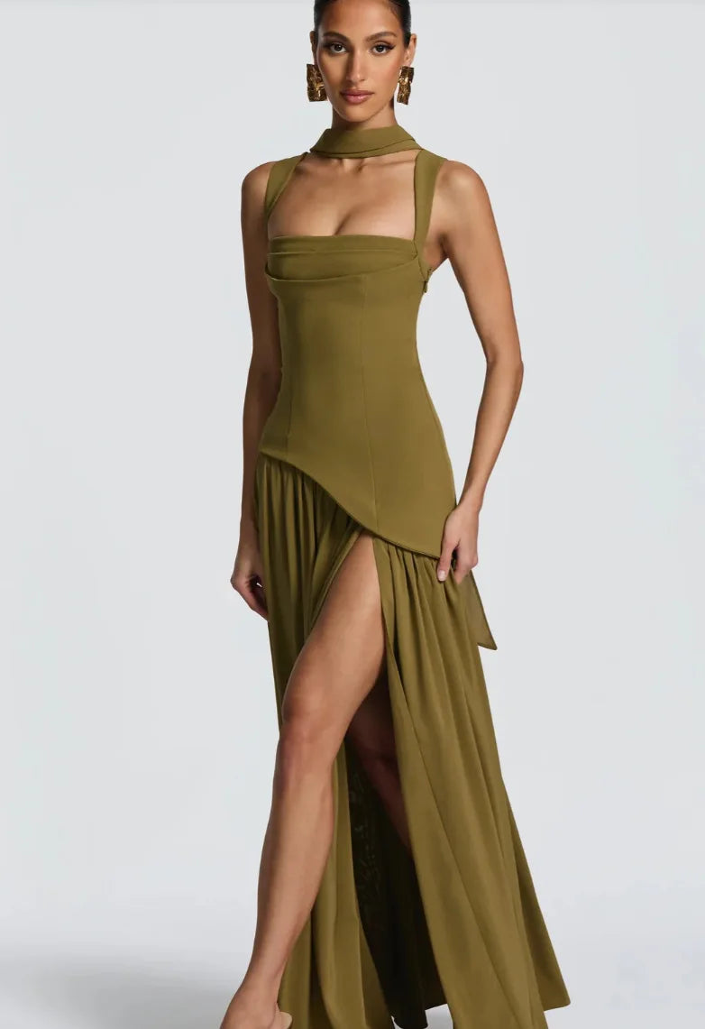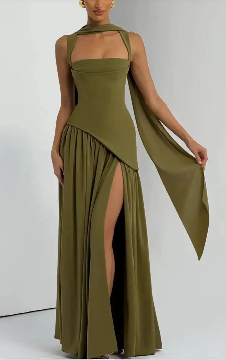 גזרה אסימטרית ייחודית עם חצאית מתרחבת ושסע גבוה שמוסיף דרמה ותנועה בכל צעד.