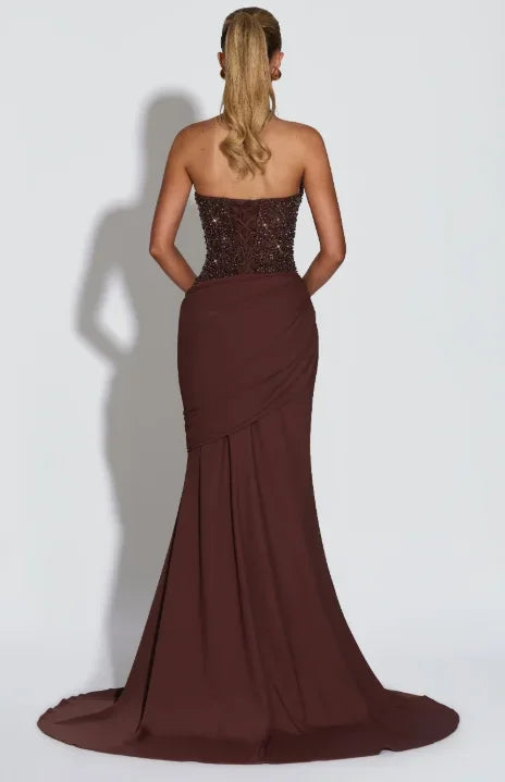 גזרת בת ים צמודה שמדגישה את קווי הגוף ונשפכת באלגנטיות עד הרצפה.