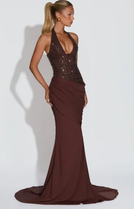 שמלה דרמטית עם מחשוף עמוק וחלק עליון משובץ פייטים נוצצים שמושכים את כל המבטים.